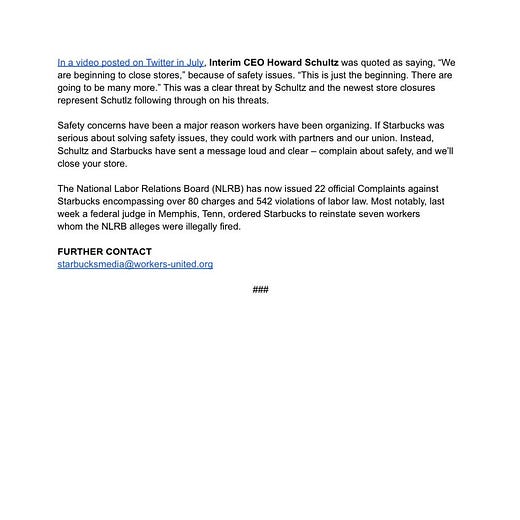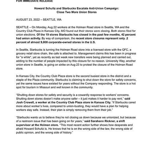 I wrote this article to speak plainly about what Starbucks is doing and why it’s working. The scale at which Starbucks is operating benefits it greatly, and we need to understand that scale to comprehend why it continues to act the way it does. And, as the Slate article mentions, other companies are now using tactics that Starbucks has shown to be effective. We need to know what impact these actions are having so we can begin to advocate for things like the PRO Act, or call for better funding for the NLRB, or contextualize why paying attention to the union fight is so important.
